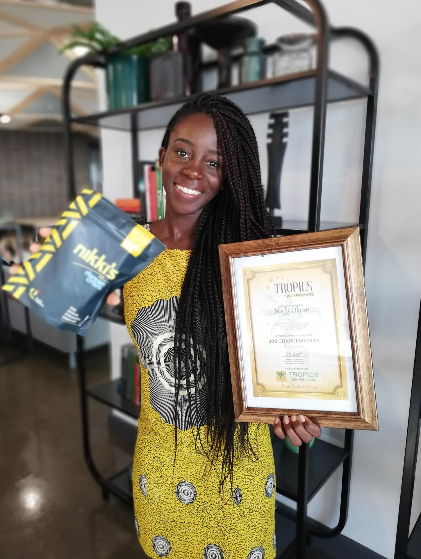 2019 - Tropics Business: 200 Changemakers - Best Agribusiness Brand • Chaku Food’s brand Nikki’s Plantain Crisps was recognized as the best Agribusiness brand and founder Nikki Okrah as one of 200 Changemakers for the Johannesburg based Tropics Magazine